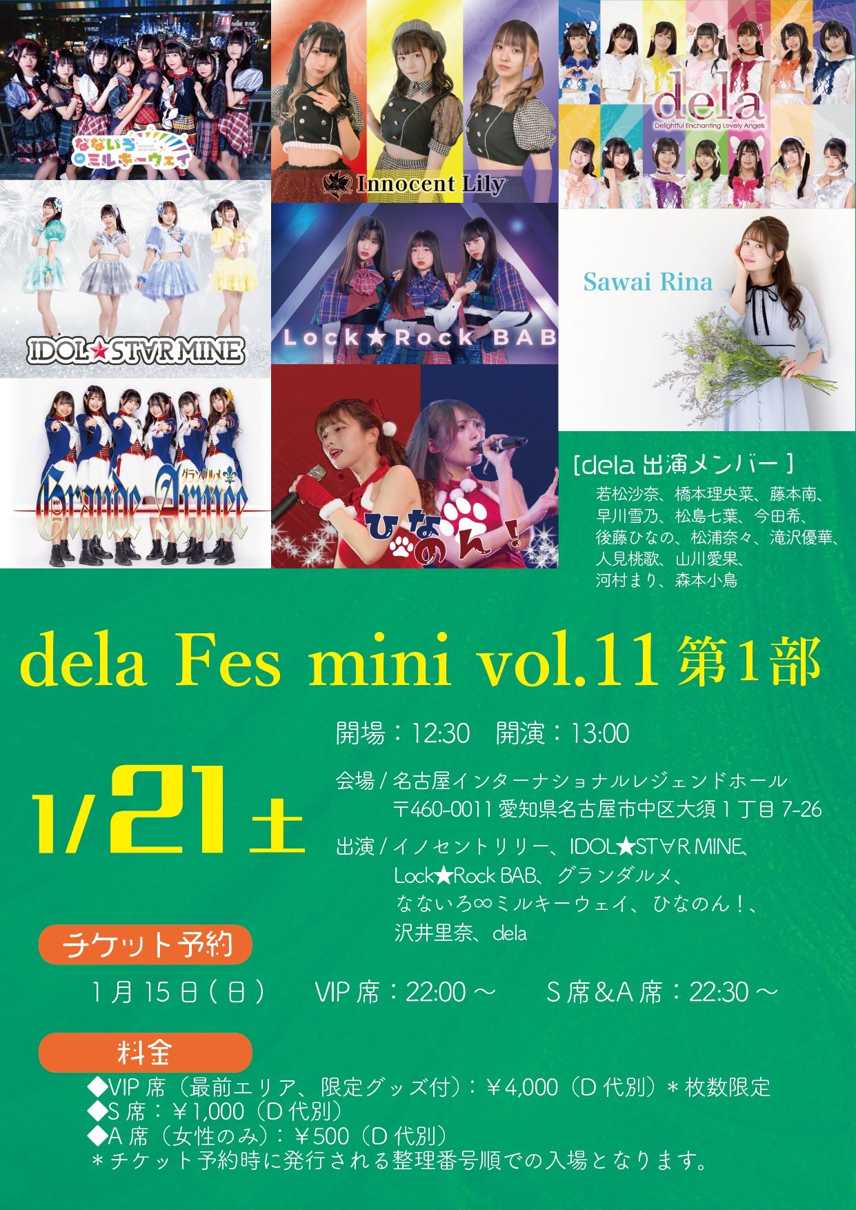 ◆VIP席(最前エリア、限定グッズ付):¥4,000(D代別) *枚数限定 ◆S席:¥1,000(D代別) ◆A席(女性のみ):¥500(D代別) *チケット予約時に発行される整理番号順での入場となります。