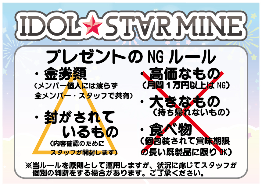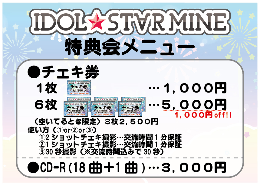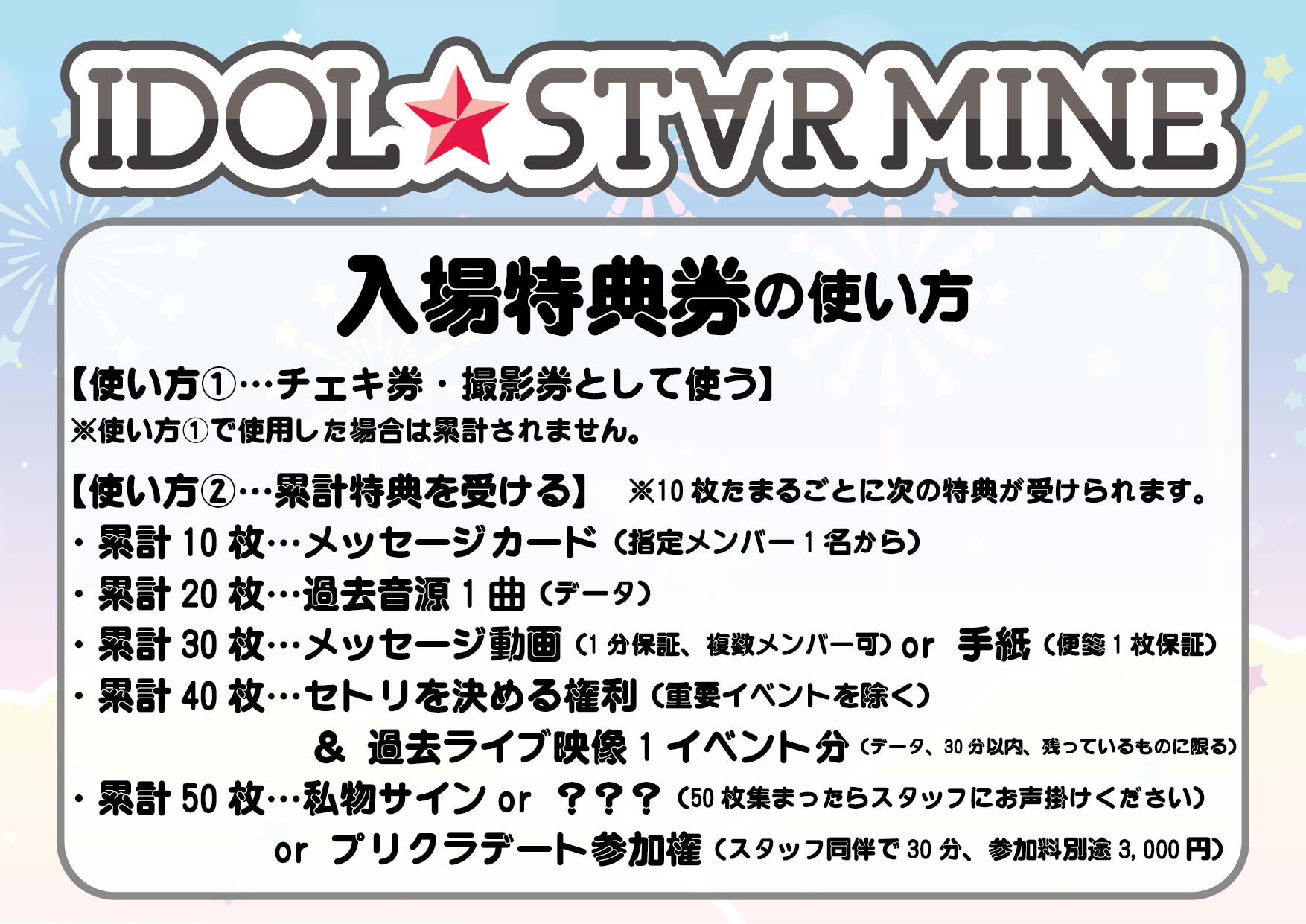 入場の際、お目当てのグループを聞かれたら「IDOL★ST∀R MINE目当てです」と答える。会場によっては、入場時にお目当て入場特典券がもらえる。